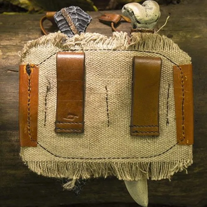 Deze unieke houder heeft een rauw uiterlijk. Hij is gemaakt van een hoge kwaliteit leer met canvas rafels en een handgestikte afwerking. Dit is de perfectie aanvulling op je LARP outfit van wilde oerpersonages en ook perfect voor Cosplay van bijvoorbeeld Game of Thrones personages. De houder wordt geleverd inclusief twee werpmessen met een oerkarakter: een benen werpmes en een stenen werpmes. De houder is uiteraard ook geschikt voor andere Epic Armoury werpmessen. Aan de achterkant heeft hij leren lussen zodat je hem aan een riem kunt hangen.