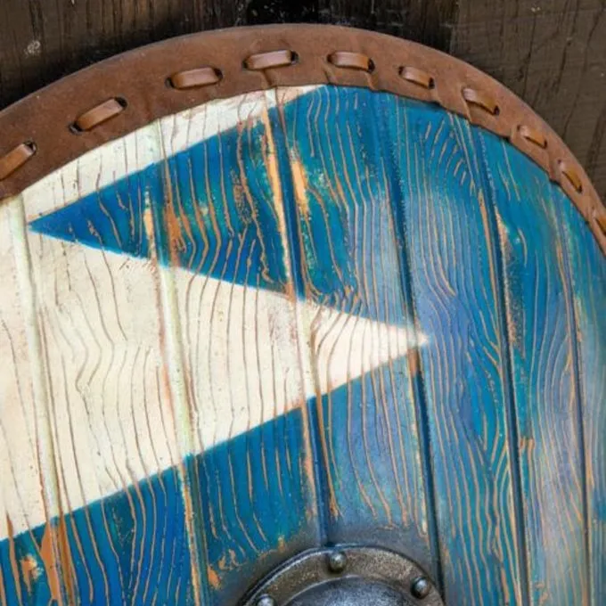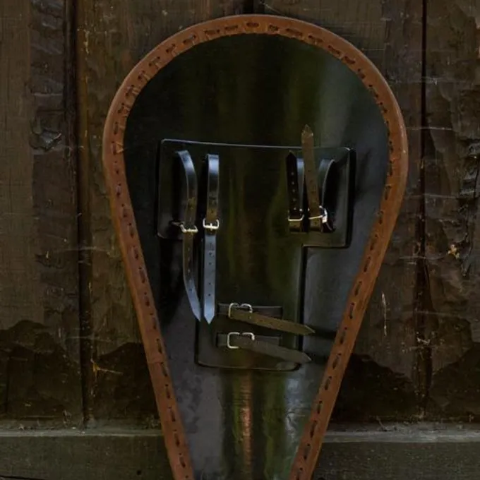 Dit LARP schild is gebaseerd op historische Normandische schilden, ook wel drupperschild genoemd. Die waren oorspronkelijk gemaakt voor ruiters maar waren ook populair onder voetsoldaten omdat ze zo hun voorbeen konden beschermen. Ze gebruikten dit soort schilden tijdens de verovering van Engeland. Het schild is prachtig en levensecht geschilderd, zodat het lijkt alsof hij is gemaakt van verticale houten planken die wit met blauw zijn geschilderd, waar je de nerven nog doorheen ziet. Hij is geschilderd met aandacht voor de kleinste details, dus hij heeft ook een versleten uiterlijk zoals dat hoort bij het schild van een krijger. De rand lijkt echt van leer dat gestikt is met een leren veter. Ook de schildknop is levensecht van staal, compleet met imitatie stalen klinknagels. De achterkant van het schild heeft verschillende riemen, zodat je hem naast eigen wens kunt dragen.
