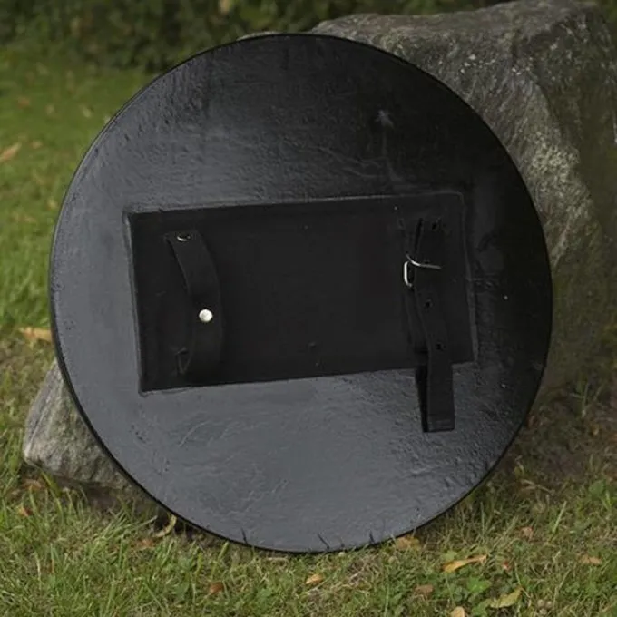 Handig en stevig larpschild gemaakt van foam en latex coating. Dit schild is verstevigd met een glasvezel kern en heeft aan de achterkant twee leren riemen waarmee hij aan de arm kan worden vastgemaakt.