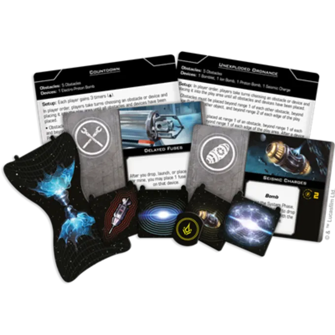 Naast de upgrade -kaarten en tokens voor nabijheidsmijnen, Conner -netten, ionenbommen en meer, bevat dit apparatenpakket zes omgevingskaarten die apparaten gebruiken als onderdeel van de instelling, die je uitnodigen om te vechten in dodelijke mijnenvelden, vlieg je schepen vliegen, vlieg je schepen, vlieg je schepen, vlieg je schepen uit, vlieg je schepen. Via Star Fields vol met niet -ontplofte munitie, of zelfs manoeuvre om continue bombardementen te voorkomen!