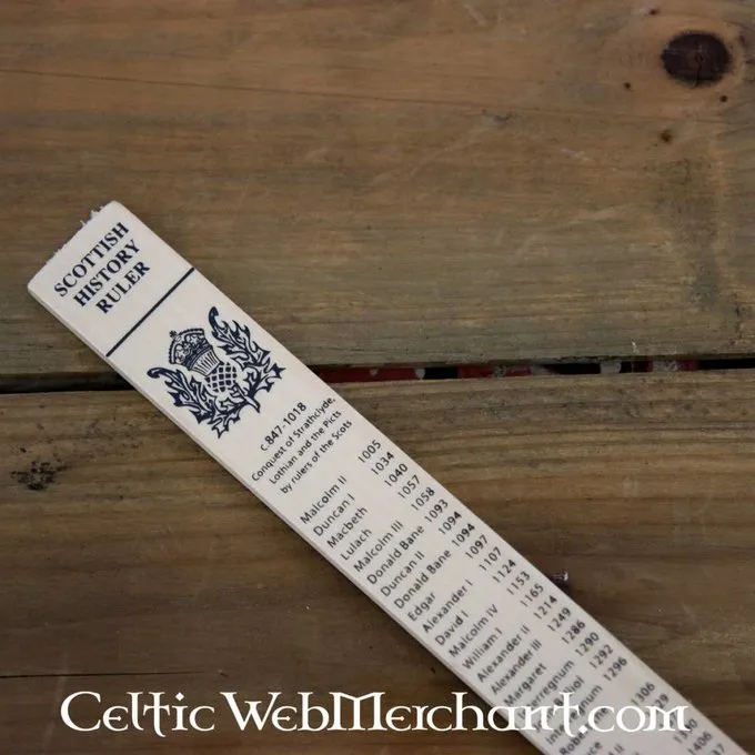 Deze houten lineaal geeft een tijdlijn van de geschiedenis van Schotland en zijn koningen en koninginnen. Hij is 30 cm lang.