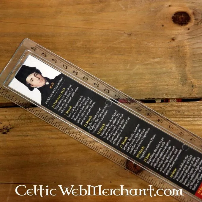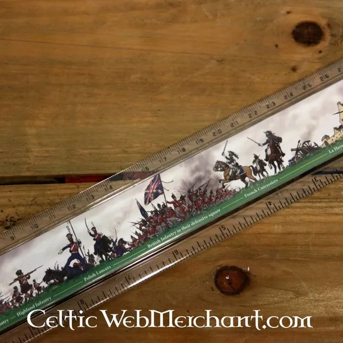 Kunststof lineaal voorzien van een panorama van de slag bij Waterloo. In het panorama staan verschillende legereenheden duidelijk afgebeeld om een beeld te vormen van hun krijgstactiek en wapenrusting. Op de achterkant staat een opsomming van de hoogtepunten van Napoleons campagnes en tijdens de slag bij Waterloo.
