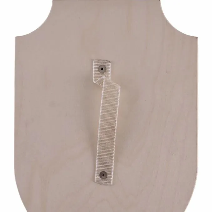 Dit schild is ongekleurd. Hierdoor kan je hem zelf verven met je eigen embleem. De achterkant van het schild heeft een kunststof bandje om hem vast te houden.