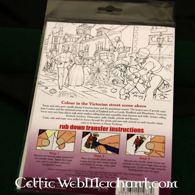 Het panorama toont een straat uit Victoriaans Engeland. De kleurplaat op de achterkant toont een scène uit het dagelijks leven.